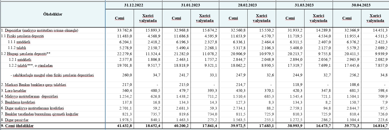 Əhalinin əmanətlərinin 6 milyard 376,2 milyon manatını müddətli, 5 milyard 579,2 milyon manatını tələbli əmanətlər təşkil edib. Apreldə müddətli əmanətlər 64,8 milyon manat, tələbli əmanətlər isə 171,2 milyon manat artıb. 2023-cü ilin ilk 4 ayında isə müddətli əmanətlər 172,1 milyon manat, tələbli əmanətlər isə 300,4 milyon manat artıb.