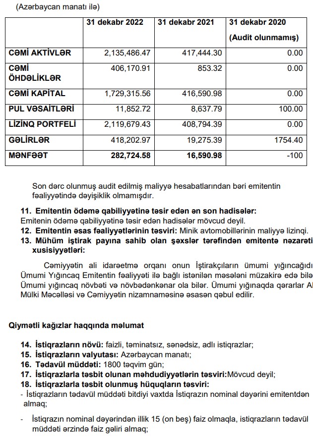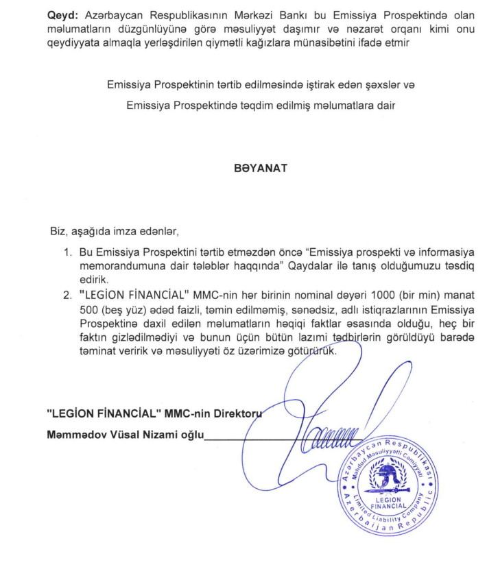 "Legion Financial" MMC 500 min manatlıq istiqraz buraxır.