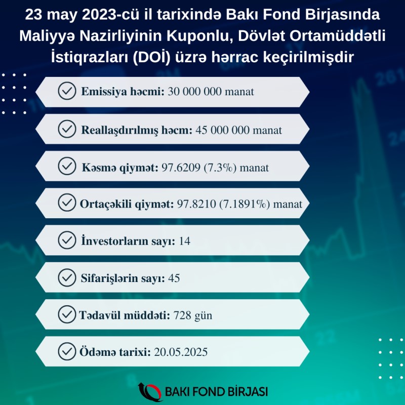 Maliyyə Nazirliyinin istiqrazlarının yerləşdirilməsi üzrə hərrac keçirilmişdir23 may 2023-cü il tarixində Bakı Fond Birjasında Azərbaycan Respublikası Maliyyə Nazirliyinin AZ0201040133 ISIN-li, 30 milyon manat həcmində, 728 gün tədavül müddətli dövlət ortamüddətli istiqrazlarının (DOİ) yerləşdirilməsi üzrə hərrac keçiriib.