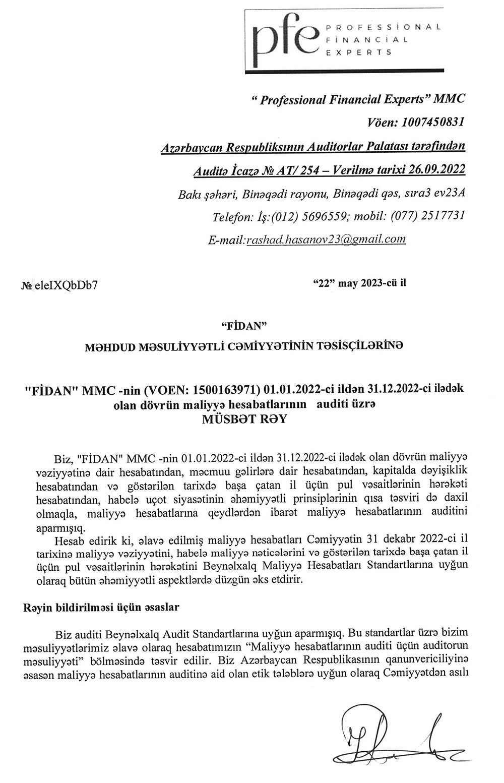 Sərnişindaşıma fəaliyyətilə məşğul olan "FİDAN" MMC-nin 31 dekabr 2022-ci il tarixində bitən il üzrə maliyyə hesabatları.