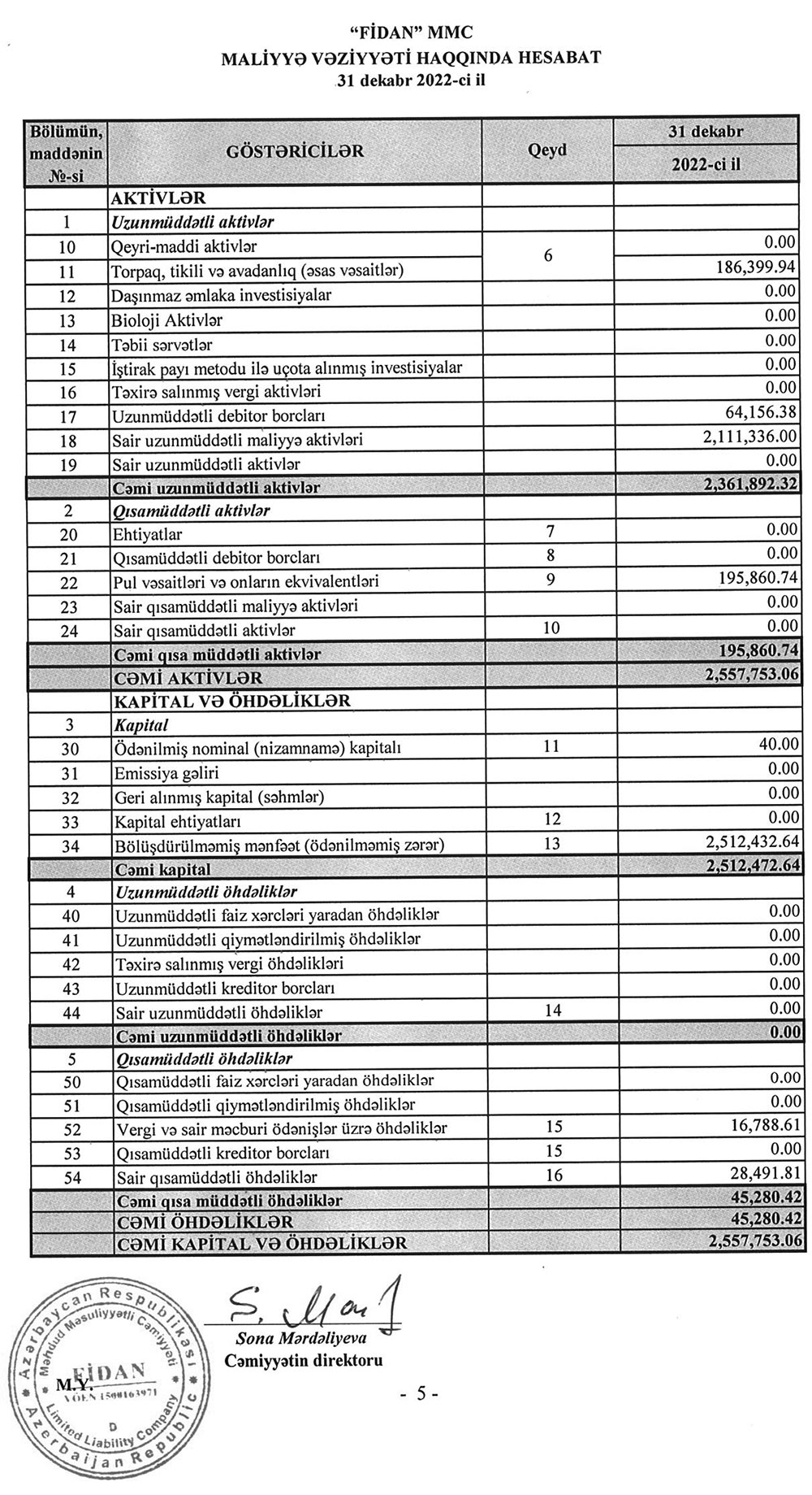31 Deakbr 2022-ci il tarixində "FİDAN" MMC 2 milyon 558 min manat cəmi aktivlərə malik olub.