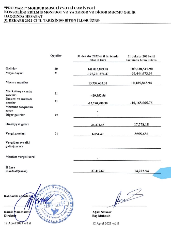 Marja.az şirkətin İnternet səhifəsində yerləşdirilmiş maliyyə hesabatlarına istinadən xəbər verir ki, "Pro - Mart" şirkətinin satışdan gəlirləri 2021-ci ildə 109 milyon 631 min manata ikən, 2022-ci ildə 141 milyon 26 min manata yüksəlib (31 milyon 395 min manat və ya 28,6% artıb).