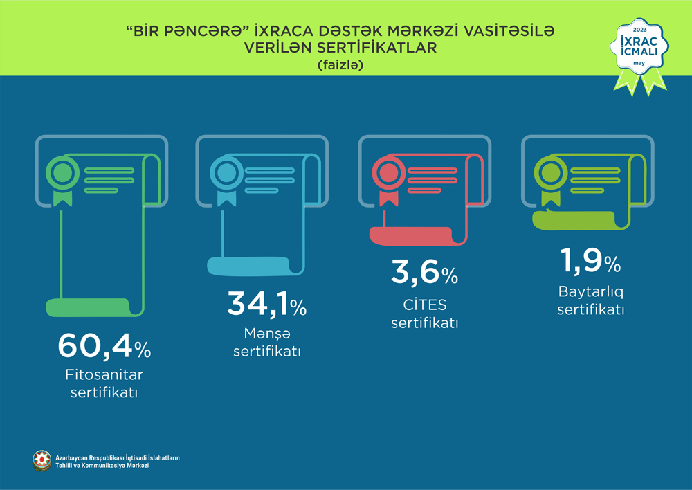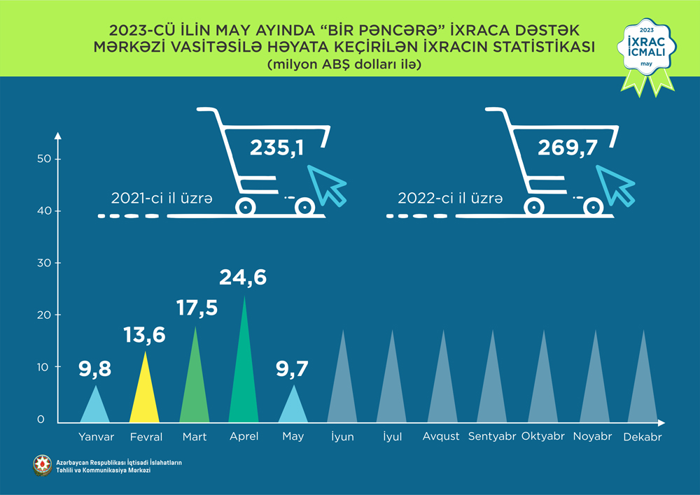 “İxrac icmalı”nda göstərilib ki, 2023-cü ilin may ayında “Bir Pəncərə” İxraca Dəstək Mərkəzi vasitəsilə həyata keçirilmiş qeyri-neft ixracının dəyəri 9,7 milyon ABŞ dolları olub.