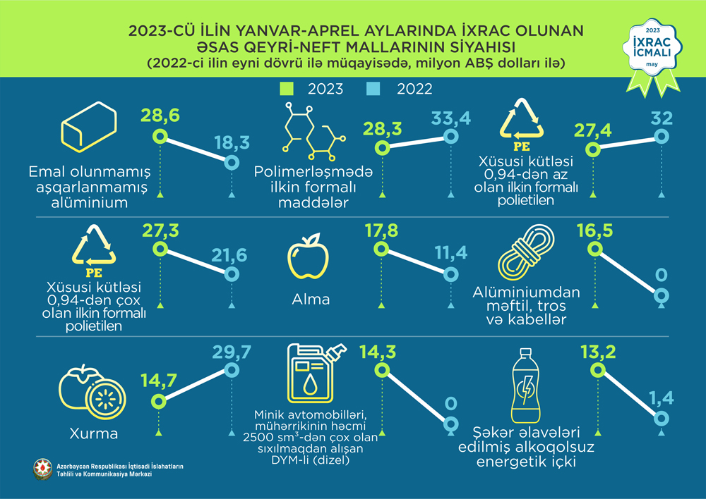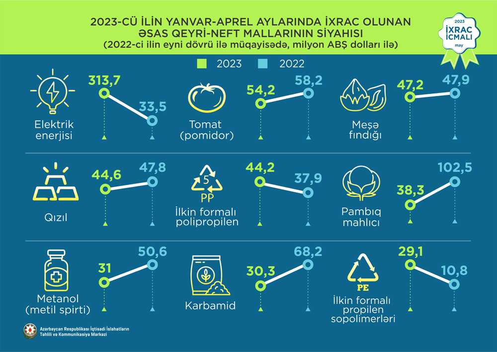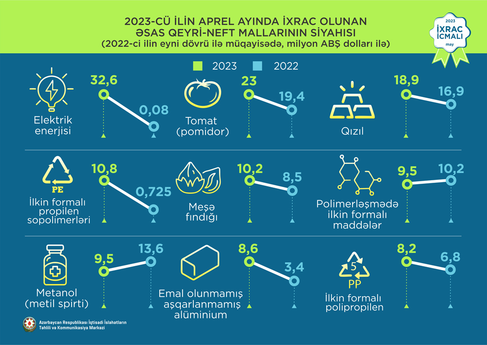 2023-cü ilin aprel ayında ixrac edilən qeyri-neft sektoruna aid malların siyahısında elektrik enerjisi (32,6 milyon ABŞ dolları) birinci, pomidor (tomat) (23 milyon ABŞ dolları) ikinci və qızıl (18,9 milyon ABŞ dolları) üçüncü olub.