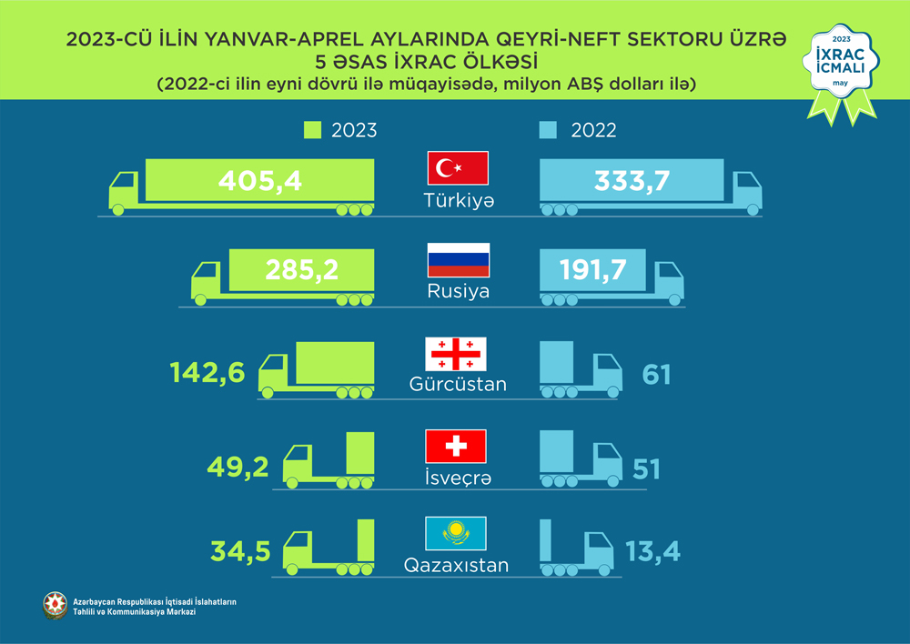2023-ci ilin yanvar-aprel ayları ərzində Türkiyəyə 405,4 milyon ABŞ dolları, Rusiya Federasiyasına 285,2 milyon ABŞ dolları, Gürcüstana 142,6 milyon ABŞ dolları, İsveçrə Konfederasiyasına 49,2 milyon ABŞ dolları, Qazaxıstana isə 34,5 milyon ABŞ dolları dəyərində qeyri-neft sektoruna aid mal ixrac olunub.