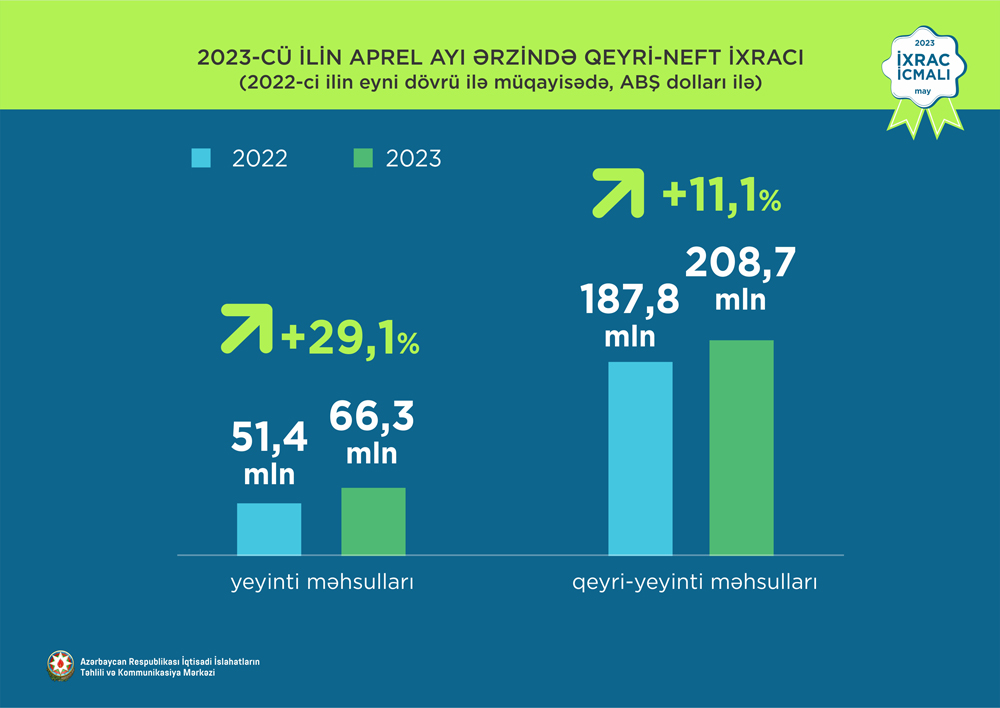 İqtisadi İslahatların Təhlili və Kommunikasiya Mərkəzinin (İİTKM) təqdim etdiyi “İxrac icmalı”nın may sayına əsasən, 2023-cü ilin yanvar-aprel ayları ərzində Azərbaycanın ümumi ixracı 12,6 milyard ABŞ dolları, qeyri-neft sektoru üzrə ixrac 1,2 milyard ABŞ dolları təşkil edib. Qeyri-neft sektoru üzrə ixrac 2022-ci ilin müvafiq dövrü ilə müqayisədə 21,2% artıb. 2023-cü ilin yanvar-aprel ayları ərzində yeyinti məhsulları üzrə ixrac 236,2 milyon ABŞ dollarına bərabər olub.