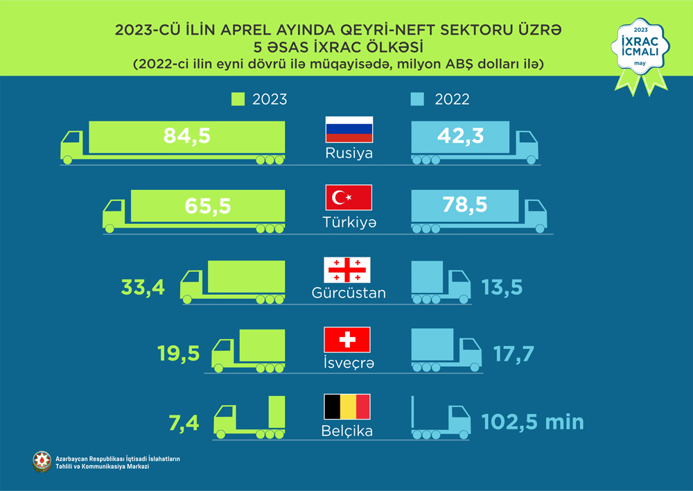 2023-cü ilin aprel ayında qeyri-neft sektoruna aid ən çox mal ixrac edilən ölkələrin siyahısında Rusiya Federasiyası (84,5 milyon ABŞ dolları) birinciliyə yüksəlib. Bu siyahıda Türkiyə (65,5 milyon ABŞ dolları) ikinci və Gürcüstan (33,4 milyon ABŞ dolları) üçüncü olub.