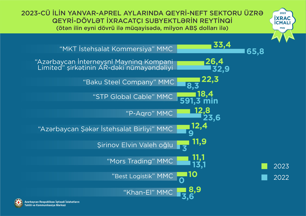 2023-cü ilin yanvar-aprel ayları üzrə hazırlanmış qeyri-dövlət ixracatçı subyektlərin reytinqində ilk onluqda aşağıdakı şirkətlər təmsil olunurlar: “MKT İstehsalat Kommersiya” MMC, “Azərbaycan İnterneyşnl Mayninq Kompani Limited” şirkətinin Azərbaycan Respublikasındakı Nümayəndəliyi, “Baku Steel Company” QSC, “STP Global Cable” MMC, “P-Aqro” MMC, “Azərbaycan Şəkər İstehsalat Birliyi” MMC, Şirinov Elvin Valeh oğlu, “Mors Trading” MMC, “Best Logistik” MMC, “Khan-El” MMC.
