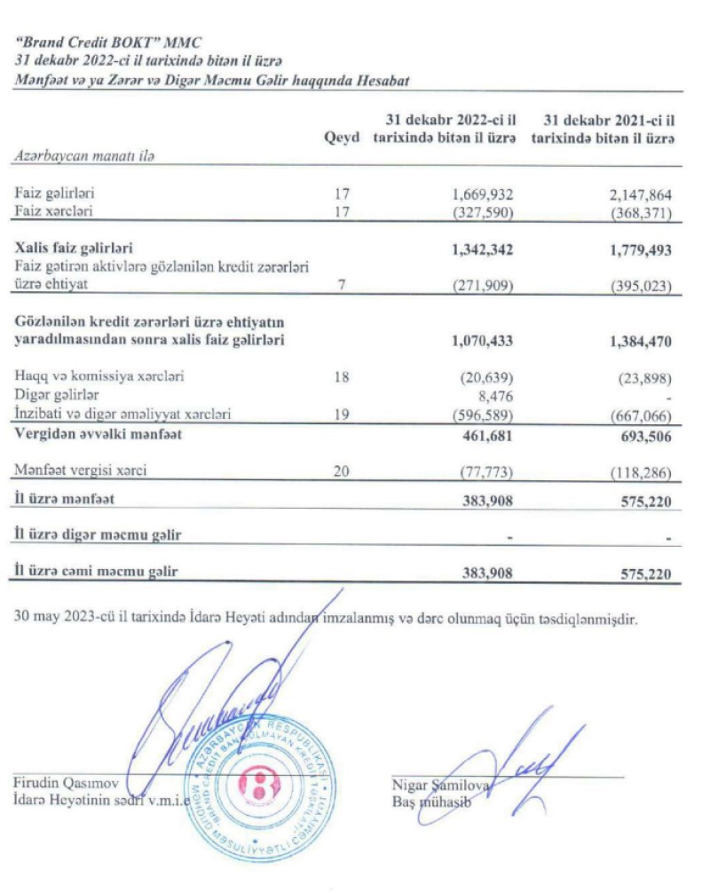 "Brand Credit BOKT" MMC 2022-ci ili 384 min manat xalis mənfəət ilə başa vurub. Təşkilat 2021-ci ili 575 min manat xalis mənfəət ilə bağlamışdı. Beləliklə, ötən il "Brand Credit BOKT"ın xalis mənfəəti 33,2% azalıb. Xalis mənfəətin azalması kredit portfelinin və faiz gəlirlərinin azalmasından qaynaqlanır.