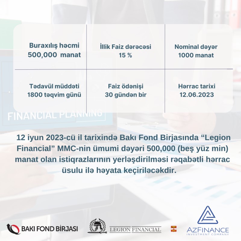 5 iyun 2023-cü il tarixində Bakı Fond Birjasının (BFB) Listinq Komitəsinin qərarı ilə BFB-nin LMP iştirakçısı olan “Legion Financial” MMC -nin ümumi dəyəri 500 min manat olan istiqrazları standart bazar seqmentində listinqə daxil edilib.