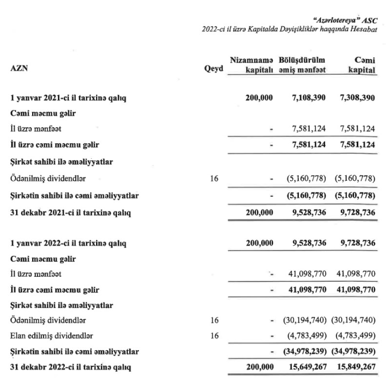 Ötən il “Azərlotereya” ASC tərəfindən elan edilmiş dividendlər isə 4 milyon 783 min manat olub. Ödənilmiş və elan edilmiş dividendlər daxil şirkətin sahibi ilə əməliyyatların məbləği 34 milyon 978 min manat olub. 2021-ci ildə “Azərlotereya”nın sahibi ilə əməliyyatlarının məbləği 5 milyon 160 min manat təşkil etmişdi.