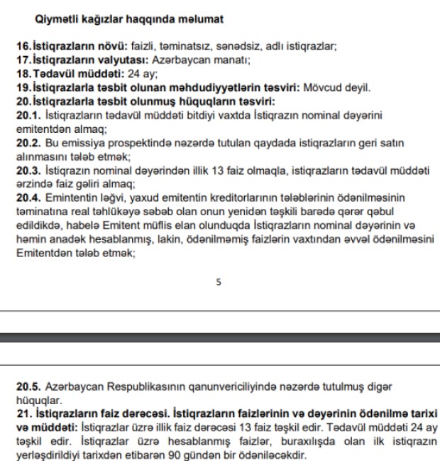 Marja.az xəbər verir ki, istiqrazların tədavül müddəti 24 ay, faiz dərəcəsi illik 13%-dir. İstiqrazlar üzrə hesablanmış faizlər, buraxılışda olan ilk istiqrazın yerləşdirildiyi tarixdən etibarən 90 gündən bir ödəniləcəkdir.