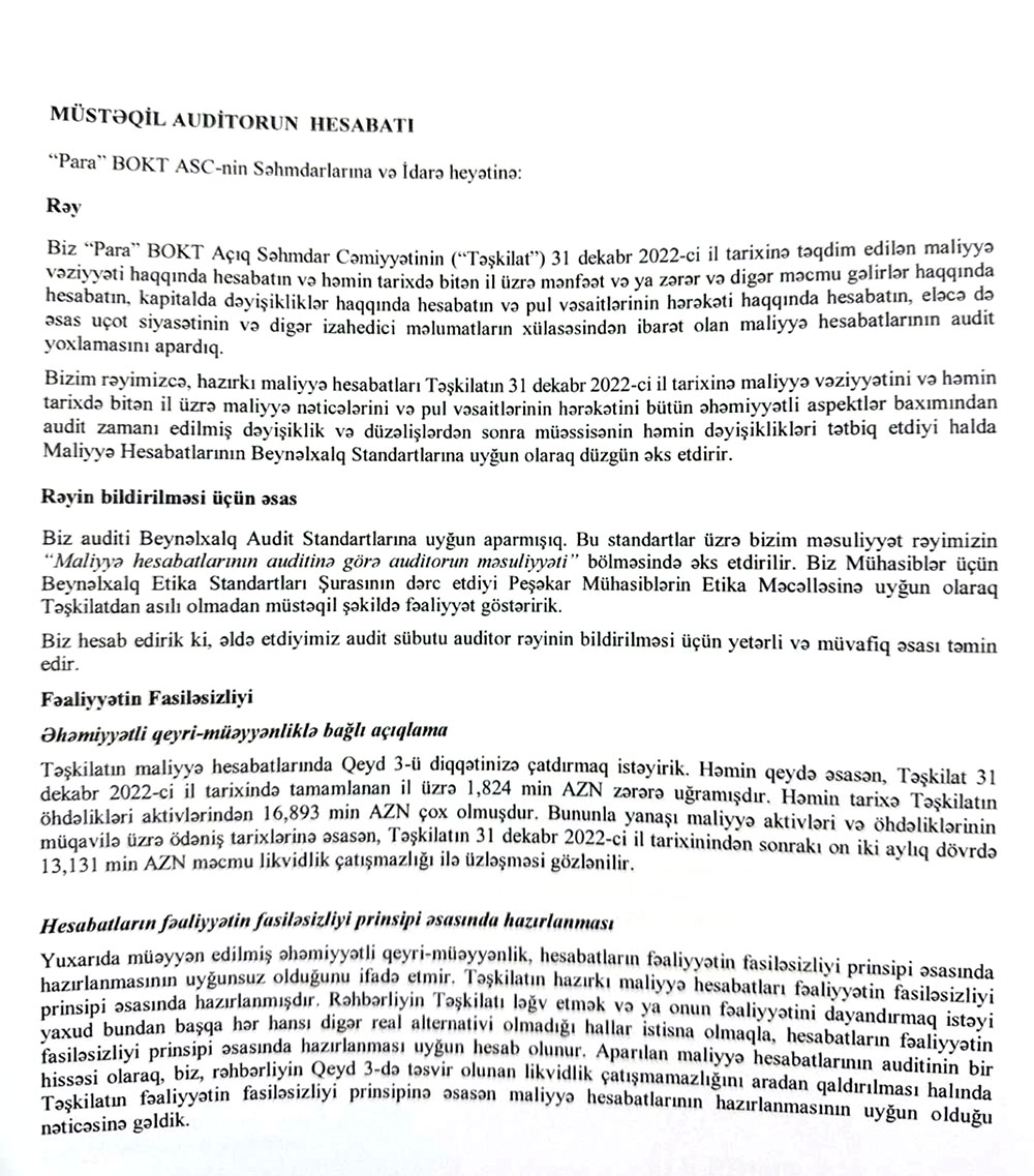 "Para Bank Olmayan Kredit Təşkilatı" ASC 31 dekabr 2022-ci il tarixində bitən il üzrə maliyyə hesabatını dərc edib.