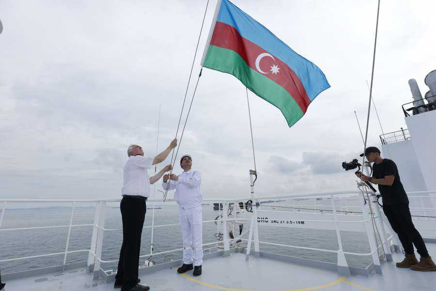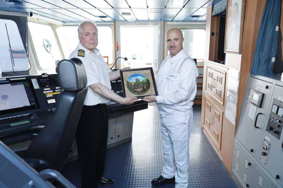 Daha sonra Dövlət Himninin sədaları altında gəmidə üçrəngli bayrağımız qaldırılıb. ASCO sədri gəmi kapitanına Qarabağ və Azərbaycanın mədəniyyət paytaxtı olan Şuşaya aid suvenirlər təqdim edib.