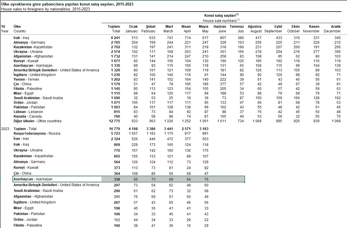 2023-cü ilin ilk 5 ayında (yanvar- may) Azərbaycan vətəndaşları Türkiyədə 336 ev alıblar. Ötən ilin eyni dövründə bu say 571 ev idi.