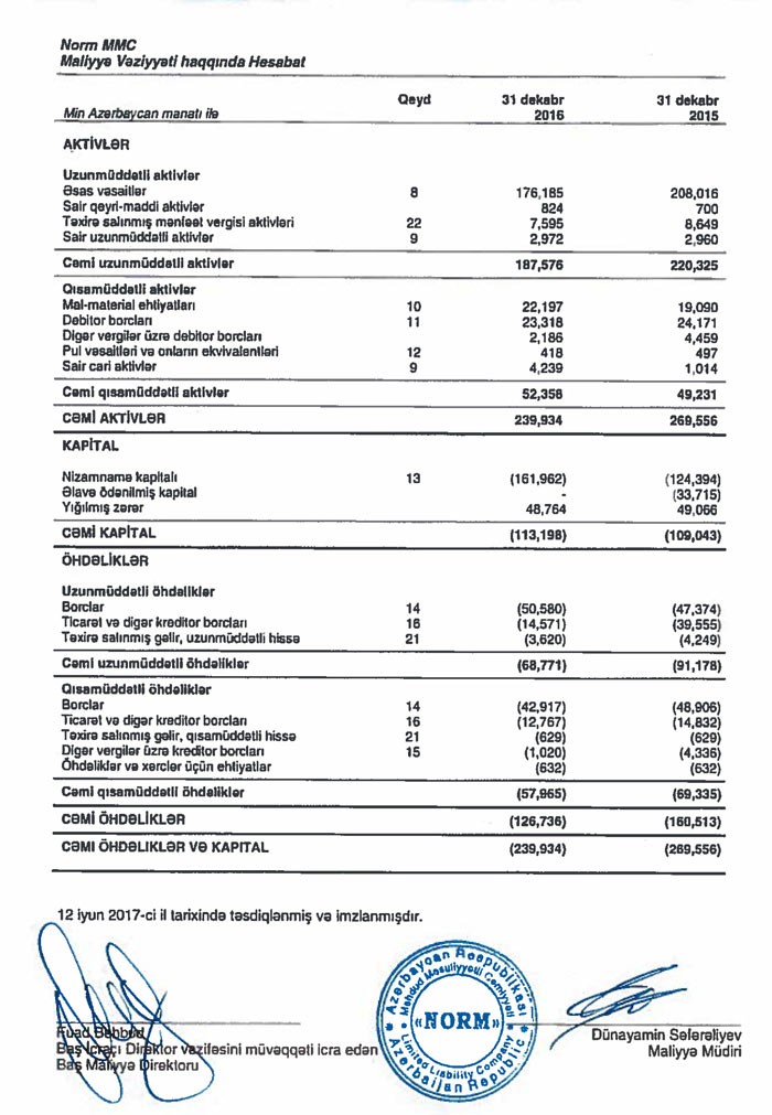 31 Dekabr 2016-cı il tarixində “Norm” MMC 240 milyon manat cəmi aktivlərə, 113,2 milyon manat cəmi kapitala və 126,8 milyon manat cəmi öhdəliklərə malik olub. Ötən il Şirkətin uzunmüddətli borcları 91,2 milyon manatdan 68,8 milyon manata, qısamüddətli borcları isə 69,3 milyon manatdan 58 milyon manata düşüb.