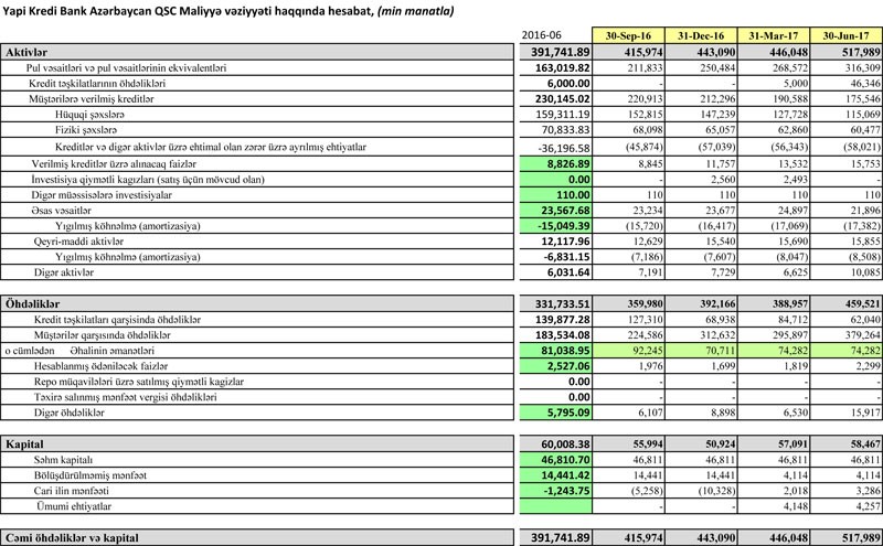 Bu ilin yanvar - iyun ayları ərzində “Yapi Kredi Bank Azərbaycan” QSC-nin cəmi aktivləri 443,09 milyon manatdan 518 milyon manata, öhdəlikləri isə 392,2 milyon manatdan 459,5 milyon manata artıb. Ötən ilin birinci yarısının yekununda, Bank, 391,7 milyon manat cəmi aktivlərə və 331,7 milyon manat cəmi öhdəliklərə malik idi. Aktivlərin artmasının əsas səbəbi “Pul vəsaitləri və pul vəsaitlərinin ekvivalentləri”nin, öhdəliklərin artmasının səbəbi isə depozitlərin artmasıdır. Belə ki, cari ilin 6 ayı ərzində müştəri hesabları (depozitlər) 312,6 milyon manatdan 379,3 milyon manata artıb.