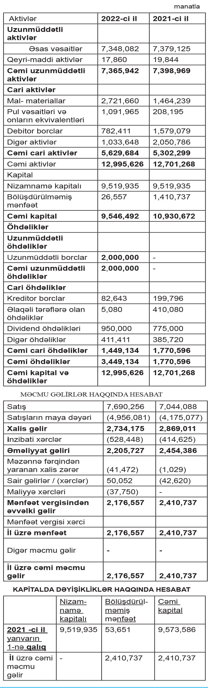 Şipris istehsalı ilə məşğul olan “Diamed Co” MMC 2022-ci ili 2 milyon 177 min manat xalis mənfəət ilə başa vurub. Şirkət 2021-ci ili 2 milyon 411 min manat xalis mənfəət ilə bağlamışdı. Beləliklə, “DİAMED CO” şirkətinin xalis mənfəəti 2022-ci ildə 2021-ci illə müqayisədə 234 min manat və ya 9,7% azalıb.