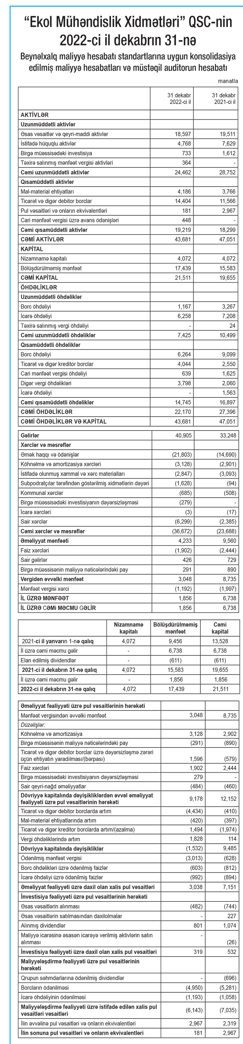 Marja.az “Ekol Mühəndislik Xidmətləri” QSC-nin 31 dekabr 2022-ci il dekabr tarixinə olan maliyyə hesabatlarına istinadən xəbər verir ki, Şirkətin gəlirləri 2021-ci ildə 33 milyon 248 min manat ikən, 2022-ci ildə 40 milyon 905 min manata yüksəlib (7 milyon 657 min manat artıb).