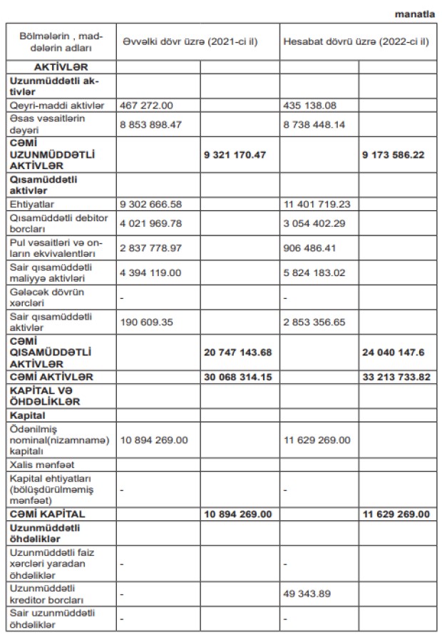 31 dekabr 2022-ci il tarixində 33 milyon 213 min manat cəmi aktivlərə malik olub. Şirkət 2021-ci ilin sonunda 30 milyon 68 min manat cəmi aktivlərə malik idi.