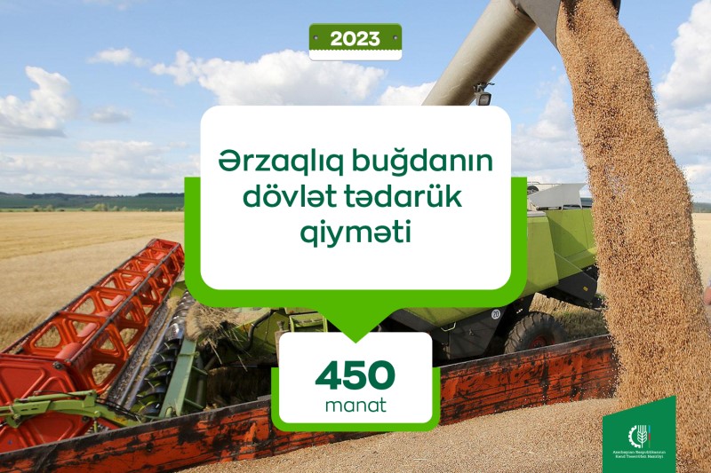 2023-cü il üçün ərzaqlıq buğdanın dövlət tədarük qiyməti 450 manat/ton olaraq müəyyənləşibKənd Təsərrüfatı Nazirliyinin yaydığı məlumatda bildirilir ki, Azərbaycan Respublikası Prezidentinin ölkədə ərzaq təhlükəsizliyinin təmin edilməsi, o cümlədən əsas ərzaq məhsulları ilə özünütəminetmə səviyyəsinin yüksəldilməsi məqsədilə qəbul etdiyi “Ərzaqlıq buğda ilə özünütəminetmə səviyyəsinin yüksəldilməsinə dair bir sıra tədbirlər haqqında” 2022-ci il 19 iyul tarixli Fərmanının icrası istiqamətində işlər davam etdirilir.