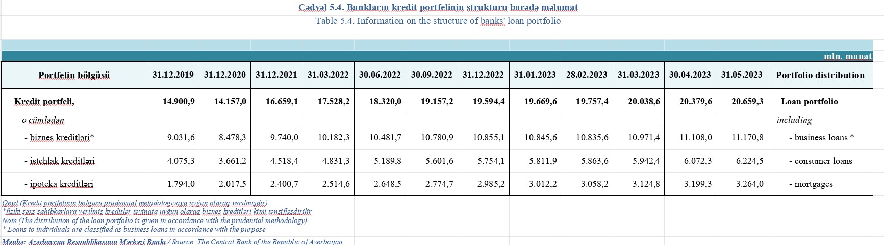 2023-cü ilin ilk 5 ayı ərzində (yanvar-may) bankların cəmi kredit portfeli 1 milyard 64 milyon 914 min manat, o cümlədən biznes kreditləri 315 milyon 744 min manat, istehlak kreditləri 470 milyon 381 min manat, ipoteka kreditləri 278 milyon 798 min manat artıb.