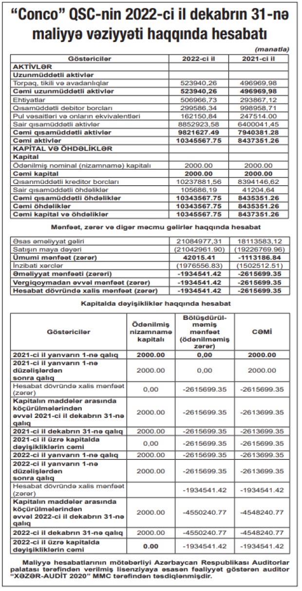 Marja.az Şirkətin 2022-ci il dekabrın 31-nə maliyyə vəziyyəti haqqında hesabatıma istinadən xəbər verir ki, 2021-ci ildə “Conco” QSC-nin əsas əməliyyat gəliri 18 milyon 114 min manat ikən, 2022-ci ildə 21 milyon 85 min manata yüksəlib ( 2 milyon 971 min manat və ya 16,4% artıb).
