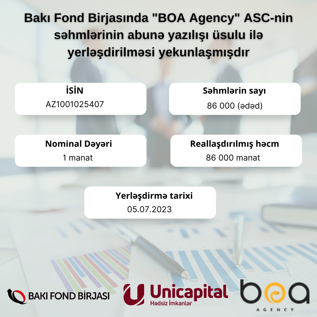 Bakı Fond Birjasında "BOA Agency" ASC-nin səhmlərinin abunə yazılışı üsulu ilə yerləşdirilməsi yekunlaşmışdır5 iyul 2023-cü il tarixində Bakı Fond Birjasında "BOA Agency" ASC-nin AZ1001025407 dövlət qeydiyyat nömrəli 86 000 manat həcmində, adi adlı sənədsiz səhmlərinin abunə yazılışı üsulu ilə yerləşdirilməsi yekunlaşıb.