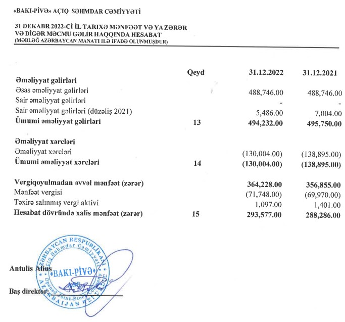 "Bakı Pivə" ASC 2022-ci ili 294 min manat xalis mənfəət ilə başa vurub. Şirkət 2021-ci ili 288 min manat xalis mənfəət ilə bağlamışdı. Beləliklə, ötən il "Bakı Pivə" ASC-nin xalis mənfəəti 2%-ə yaxına artıb.