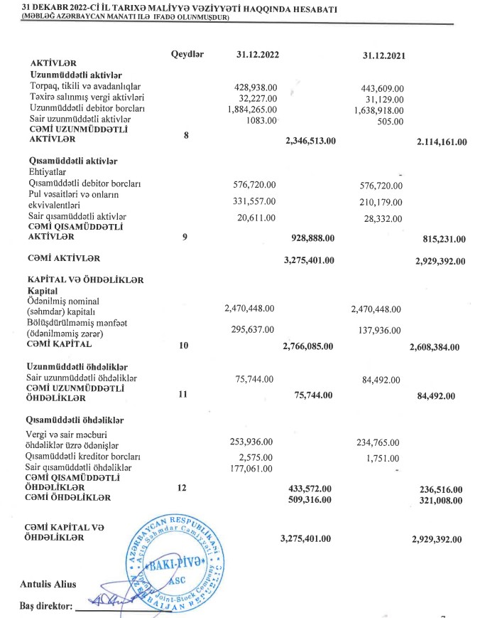 "Bakı Pivə" ASC 31 Dekabr 2022-ci il tarixində 3 milyon 275 min manat cəmi aktivlərə malik olub. Şirkət 2021-ci ilin sonunda 2 milyon 929 min manat cəmi aktivlərə malik idi.