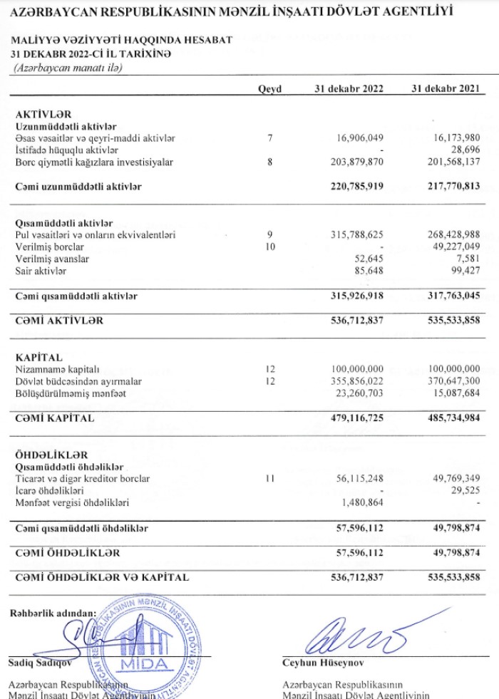 Xəbər verdiyimiz kimi, Azərbaycan Respublikası Mənzil İnşaatı Dövlət Agentliyi (MİDA) 2022-ci ili 8 milyon 173 min manat xalis mənfəət ilə başa vurub. Agentlik 2021-ci ili 1 milyon 509 min manat xalis mənfəət ilə bağlamışdı. Beləliklə, ötən il Agentliyin xalis mənfəəti 5,4 dəfə artıb. Mənzil İnşaatı Dövlət Agentliyinin maliyyə gəliləri 2021-ci ildə 10 milyon 176 min manat ikən, 2022-ci ildə 10 milyon 849 min manata yüksəlib. 2021-ci ildə dövlərdən 2,1 milyon manat yardım almış Agentlik, ötən il dövlətdən yardım almayıb.