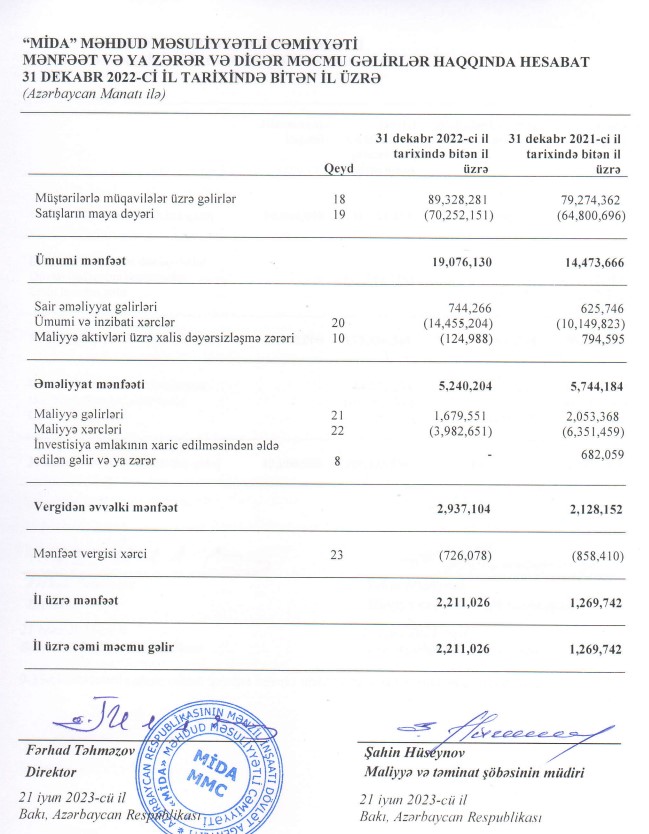 Azərbaycan Respublikası Mənzil İnşaatı Dövlət Agentliyinin tabeliyində olan "MİDA" MMC 2022-ci ili 2 milyon 211 min manat xalis mənfəət ilə başa vurub. Şirkət 2021-ci ili 1 milyon 270 min manat xalis mənfəət ilə bağlamışdı. Beləliklə, ötən il "MİDA" MMC-nin xalis mənfəəti 941 min manat və ya 74% artıb.