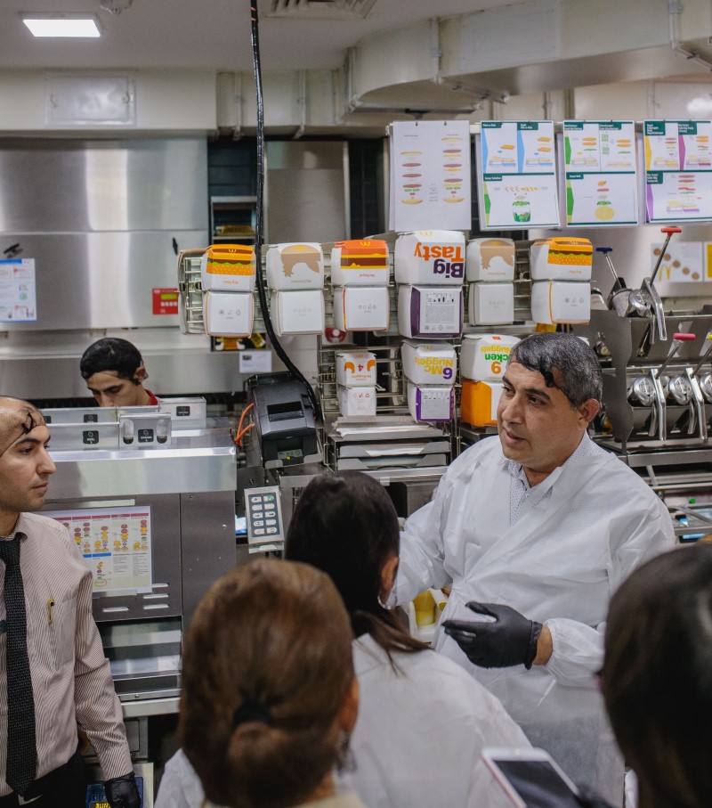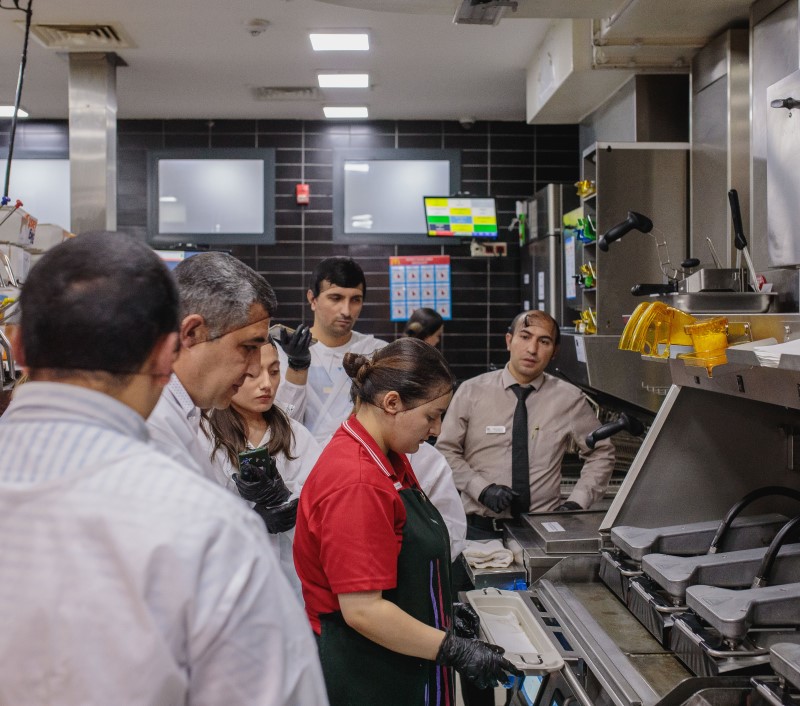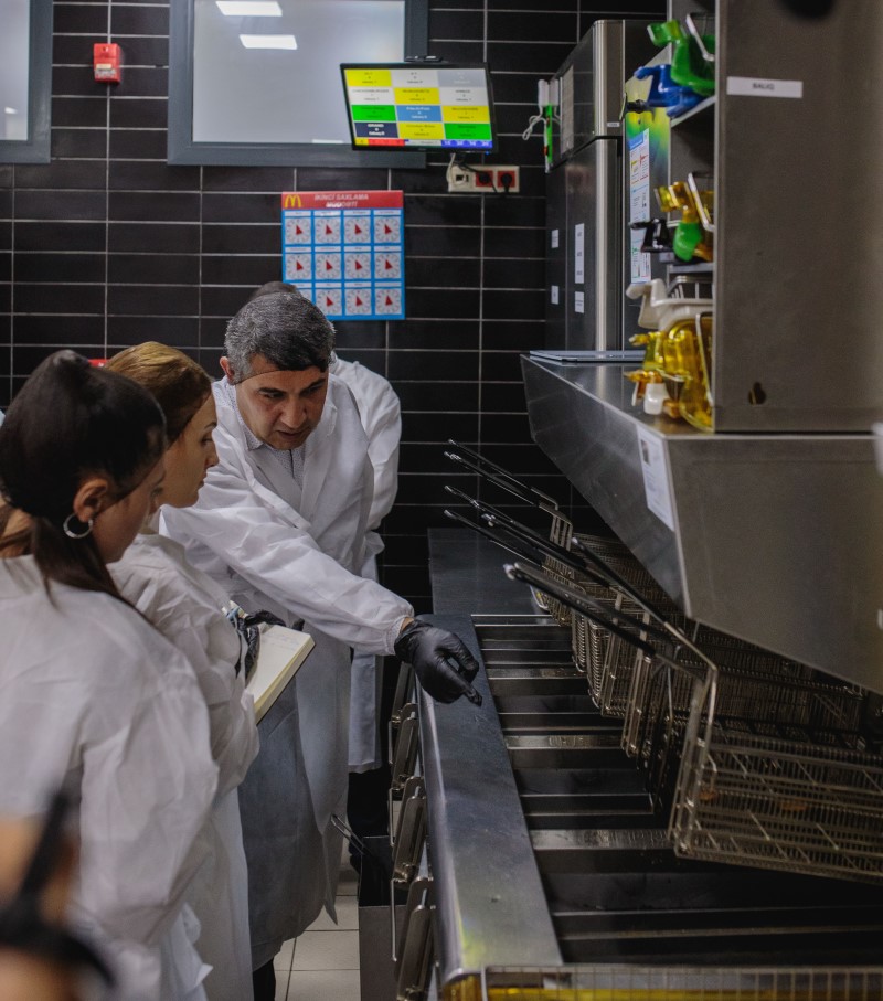Fürsətdən istifadə edib, Tbilisi pr. 1056 ünvanında yerləşən McDonald’s restoranının mətbəxində də olduq. Keyfiyyətə Nəzarət şöbəsinin rəhbəri Anar bəy mətbəxdə yeməklərin hansı şəraitdə hazırlanması ilə bizi tanış etdi. Əminliklə deyə bilərəm ki, mətbəxdə hər şey təmiz, steril şəraitdədir. Bütün ərzaqlar öz temperaturuna uyğun saxlanılır və bu işə rəqəmsal qida təhlükəsizliyi proqramı ilə nəzarət edilir. Mətbəxdə istifadə olunan kənd təsərrüfatı məhsulları yerli istehsaldır. Çox zaman müştərilər yeməklərdə ət və yağdan narahat olurlar. Elə isə gəlin mifləri dağıdaq. Burada hər məhsul öz yağ vannasında bişir və bir-birinə qarışmır. Yağların turşuluq dərəcəsi xüsusi lakmus kağızları ilə yoxlanılır, göstərici 1%-dən yuxarı olduqda isə yağ dərhal yenilənir. Həmçinin, onların vizual görünüşünə - rəngi və ətrinə də gündəlik nəzarət olunur. Məhsullar üçün istifadə olunan bitki yağı yüksək keyfiyyətli günəbaxan yağıdır.