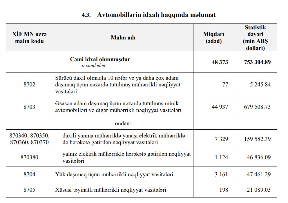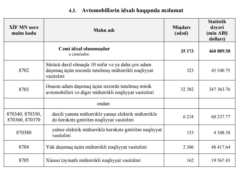 Ötən il bu nəqliyyat vasitələri üzrə idxal müvafiq olaraq 153 ədəd və 6 218 ədəd olmuşdu.