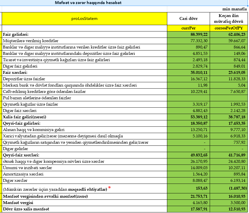 Ötən ilin analoji dövrü ilə müqayisədə Bankın faiz gəlirləri 37%-dən çox artaraq 53,39 milyon manata, xalis əməliyyat mənfəəti təxminən 2 dəfə artaraq 21,9 milyon manata, xalis mənfəəti isə 41% artaraq 17,59 milyon manata çatıb.