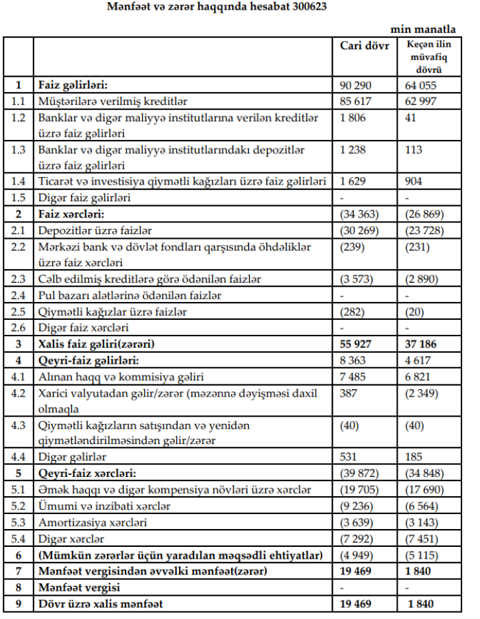Müqayisə üçün qeyd edək ki, 2022-ci ilin birinci yarısında "AccessBank"ın cəmi əməliyyat gəlirləri 68 milyon 672 min manat, cəmi əməliyat xərcləri 61 milyon 717 min manat, əməliyyat mənfəəti 6 milyon 955 min manat təşkil etmiş, ehtiyata 5 milyon 115 min manat ayırmışdı.