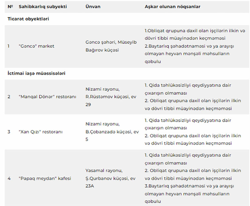 Agentlikdən verilən məlumata görə, bu müəssisələrdə qida təhlükəsizliyi qeydiyyatına dair çıxarışın olmaması ilə bağlı 3, obliqat qrupuna daxil olan işçilərin ilkin və dövri tibbi müayinədən keçirilməməsi ilə bağlı 8, baytarlıq şəhadətnaməsi və ya arayışı olmayan heyvan mənşəli məhsulların qəbulu ilə bağlı 6, qida məhsullarının açıq şəkildə satışı və qablaşdırılmasına qoyulan tələblərə dair uyğunsuzluq ilə bağlı 1 nöqsan aşkarlanıb. Aşkar edilmiş nöqsanların aradan qaldırılması ilə bağlı icrası məcburi göstərişlər verilib.