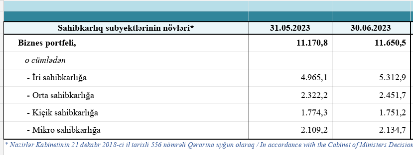 Biznes kreditlərinin 45,6%-i və ya 5 milyard 312,9 manatı iri sahibkarlığa, 21,1%-i və ya 2 milyard 451,6 milyon manatı orta sahibkarlığa, 15%-i və ya 1 milyard 751,2 milyon manatı kiçik sahibkarlığa, 18,3%-i və ya 2 milyard 134,7 milyon manatı mikro sahibkarlığa verilib.