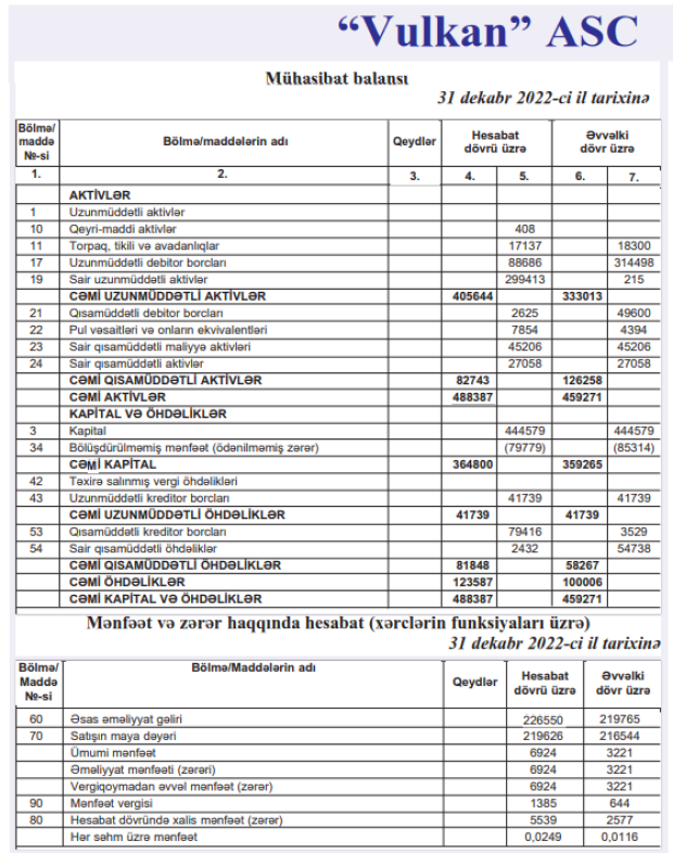 "Vulkan" ASC 2022-ci ili 5 min 539 manat xalis mənfəət ilə başa vurub. ASC 2021-ci ili 2 min 577 manat xalis mənfəət ilə bağlamışdı.