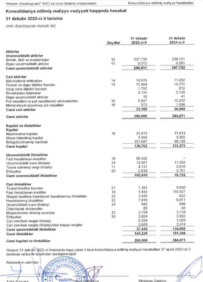 Ötən il "Holcim Azərbaycan" ASC-nin cəmi aktivləri cüzi azalaraq 280 milyon manata düşüb. 2021-ci ilin sonunda Şirkətin cəmi aktivləri 284 milyon 671 min manata çatmışdı.