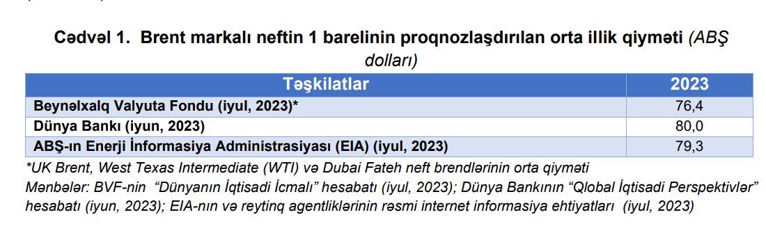 "Beynəlxalq maliyyə institutları və agentlikləri tərəfindən 2023-cü ildə Brent markalı xam neftin bir barrelinin orta illik satış qiymətinin 75-80 ABŞ dolları civarında olacağı proqnozlaşdırılır",