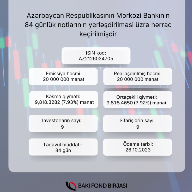 3 avqust 2023-cü il tarixində Bakı Fond Birjasında Azərbaycan Respublikasının Mərkəzi Bankının (ARMB) AZ2126024705 dövlət qeydiyyat nömrəli 20 milyon manat həcmində 84 gün tədavül müddətli notlarının yerləşdirilməsi üzrə hərrac keçirilmişdir.
