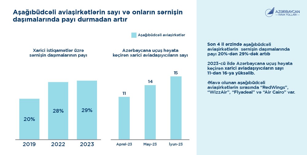 “Bu məlumatlar yeni aviaşirkətlərin cəlb edilməsi və sərnişinlər üçün imkanların genişləndirilməsi istiqamətində gedən davamlı fəaliyyətimizi təsdiqləyir. 2019-cu ildən etibarən xarici aşağıbüdcəli aviaşirkətləri seçən sərnişinlərin sayı 29%-ə yüksəlib. Biz bundan sonra da büdcəli səyahətlər üçün yeni perspektivlər açmağa və Bakını daha da əlçatan və cəlbedici turizm məkanına çevirməyə davam edəcəyik” – deyə Heydər Əliyev Beynəlxalq Aeroportunun direktoru vurğulayıb.