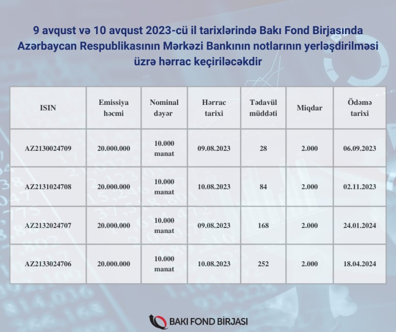 9 avqust və 10 avqust 2023-cü il tarixlərində Bakı Fond Birjasında Azərbaycan Respublikasının Mərkəzi Bankının 80 milyon manatlıq notlarının yerləşdirilməsi üzrə hərrac keçiriləcək.