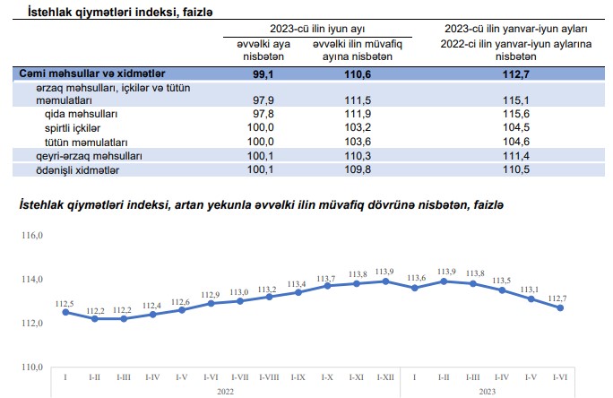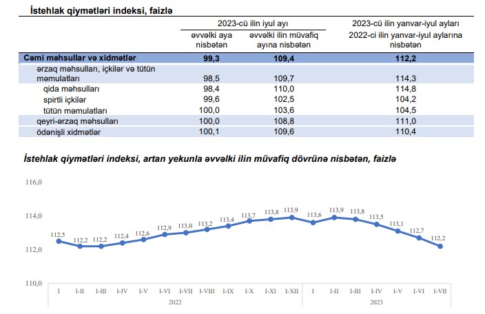 Qeyd edilib ki, 2023-cü ilin iyul ayında istehlak qiymətləri indeksi əvvəlki aya nisbətən 0,7 faiz azalıb, əvvəlki ilin iyul ayına nisbətən 9,4 faiz artıb. Xatırladaq ki, 2023-cü ilin iyun ayında istehlak qiymətləri indeksi əvvəlki aya nisbətən 0,9 faiz azalmış, əvvəlki ilin iyun ayına nisbətən 10,6 faiz artmışdı.