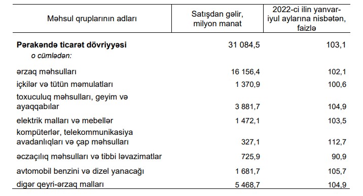 2023-cü ilin yanvar-iyul aylarında pərakəndə ticarət şəbəkəsində istehlakçılara 31,1 milyard manatlıq, o cümlədən 17,5 milyard manatlıq ərzaq məhsulları, içkilər və tütün məmulatları, 13,6 milyard manatlıq qeyri-ərzaq malları satılmışdır.