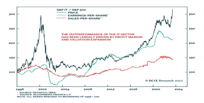 1996-cı ildən etibarən İT sektorunda səhm üzrə satış “S&P 500” ilə müqayisədə 45%, səhm üzrə gəlir 112%, səhm üzrə qiymət isə 216% artıb. Beləliklə, İT səhmlərinin yüksək göstəricilərinin təxminən 80%-i seçilmiş şirkətlər qrupu arasında artan mənfəət marjası və investorların onlara təyin etdiyi daha yüksək gəlirlilik əmsalları ilə əlaqələndirilə bilər.