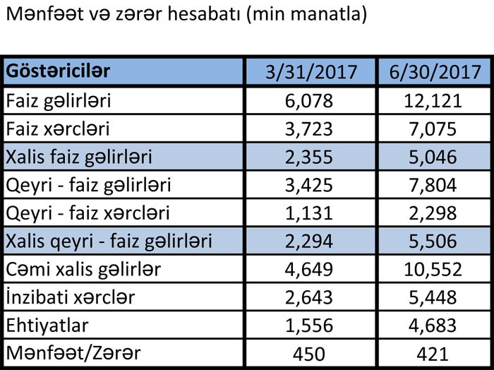 2016-cı ilin birnci yarısı ilə müqayisədə cari ilin 6 ayında Bankın faiz gəlirləri 15 milyon 584 min manatdan 12 milyon 121 min manata düşsə də, qeyri-faiz gəlirləri 70%-ə yaxın artaraq 4 milyon 609 min manatdan 7 milyon 804 min manata qalxıb.