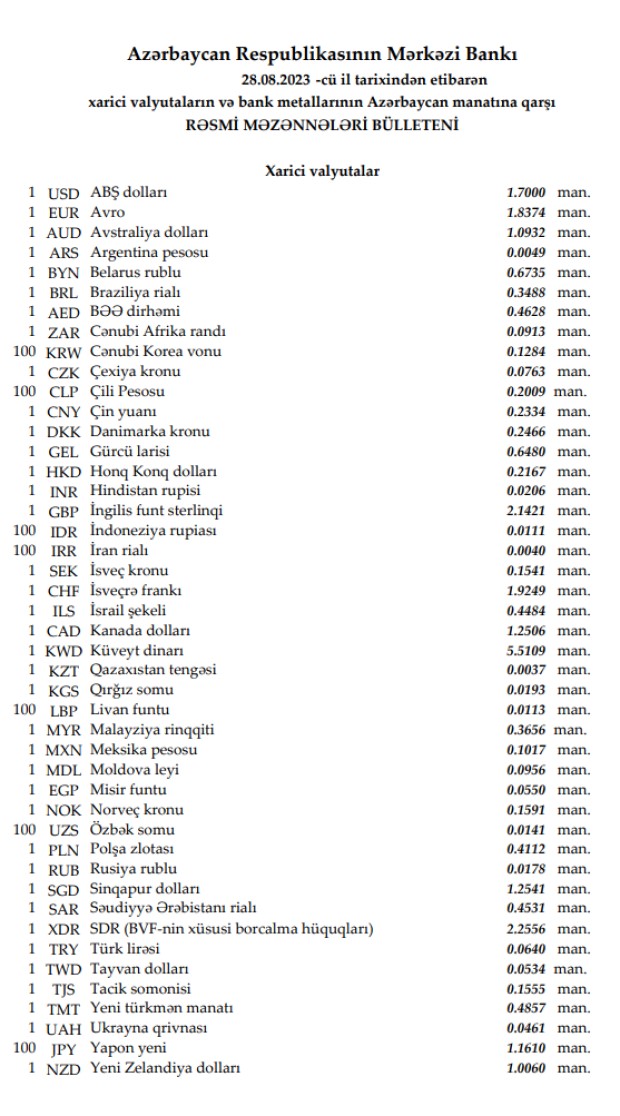 Rəsmi məzənnələr açıqlandı