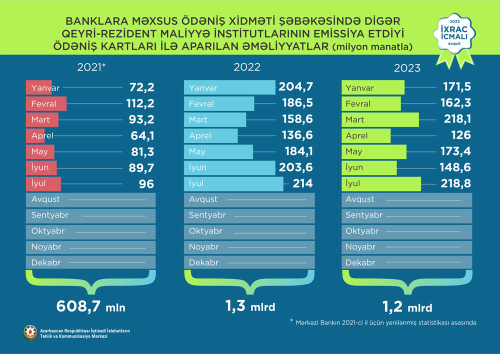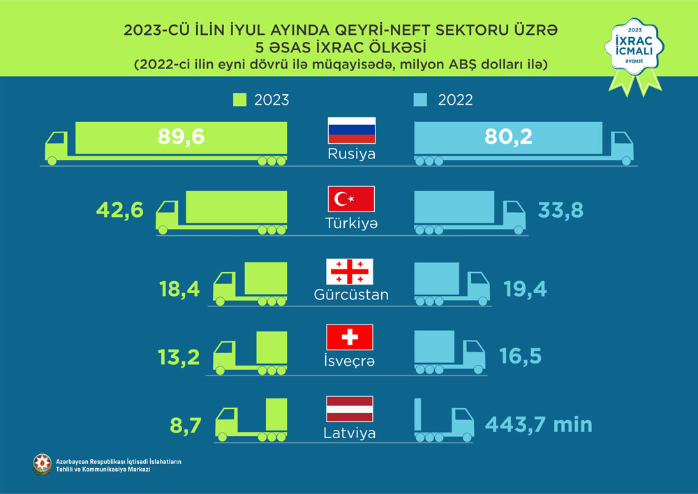2023-cü ilin yanvar-iyul ayları ərzində Rusiya Federasiyasına 641,9 milyon ABŞ dolları, Türkiyəyə 555,1 milyon ABŞ dolları, Gürcüstana 198,7 milyon ABŞ dolları,İsveçrə Konfederasiyasına 81,8 milyon ABŞ dolları, Qazaxıstana isə 66,5 milyon ABŞ dolları dəyərində qeyri-neft sektoruna aid mal ixrac olunub.